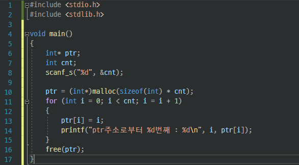 malloc함수는 void포인터를 반환하는 함수이므로 10줄에서 int포인터인 ptr에 맞춰서 int*로 자료형을 바꿔 사용했다.