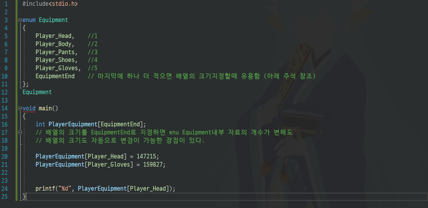 enum내부의 상수들은 자동적으로 0부터 순서대로 1,2,3,4,,,의 값들을 부여받게된다.